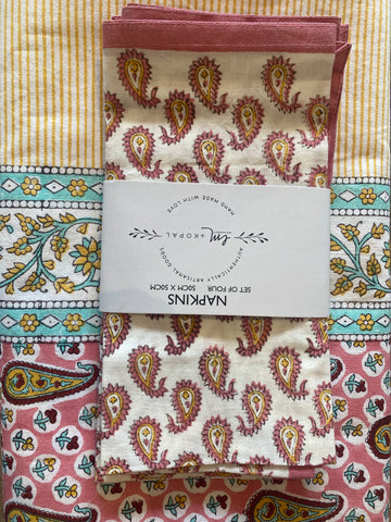 Subtle tones of blush and matcha, will pair beautifully with our Santa Fe tablecloth. Our napkins have been hand block printed by artisans on 100% pure cotton.